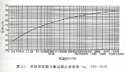 或ns> 210時,單級單吸磁力驅動離心泵的效率值為由圖2-5查得的效率值與因比轉數ns。不同而引起的效率修正值之和。